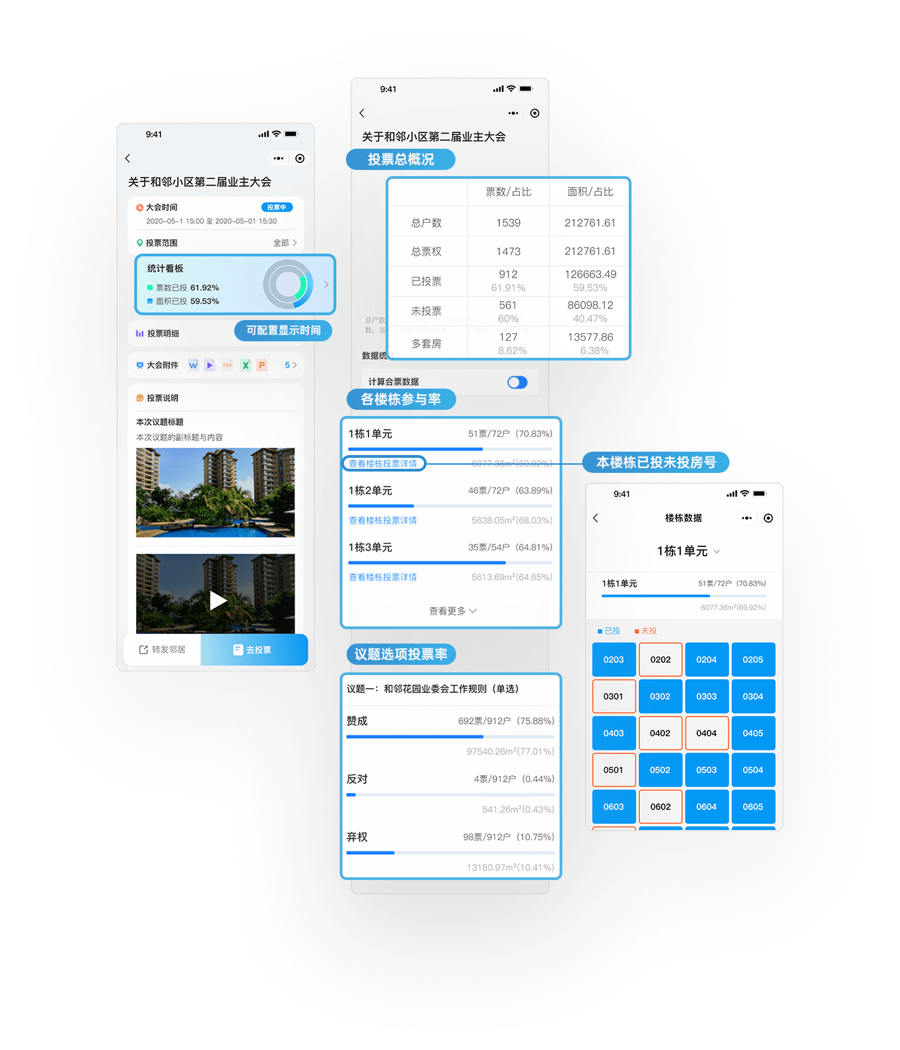支持全流程、实时呈现业主大会的投票参与情况,已投和未投可以一目了然,投票过程做到公开透明,有力保障业主的知情权,让业主更安心、更放心。