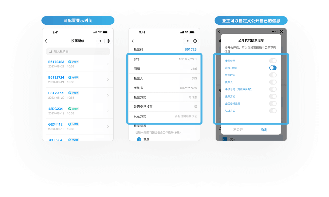 支持线上公示投票结果全明细,每一票数据清晰可溯,确保投票结果接受全体业主的监督核查,充分保障业主知情权,切实消除信息壁垒,让业主对投票结果更安心、更放心。