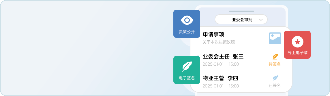 公共决策公开透明是维护业主权益、保障小区有序管理的核心。如:会议管理记录业委会讨论过程、表决结果,明确决策依据与责任;印章使用注明使用事由、批准人、经手人及文件去向,确保可追溯。通过和邻阳光透明小区平台,让全体业主充分知晓并监督,保障决策公正公平。